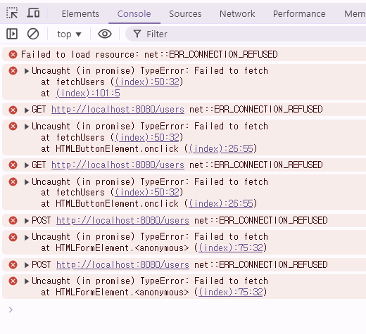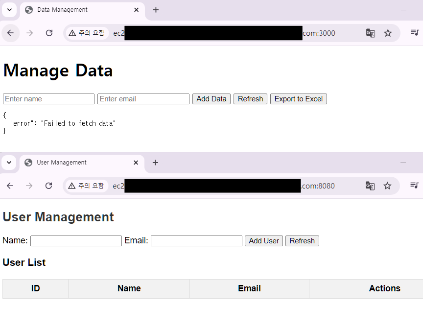 에러의 원인은 스프링 부트 내부 코드에서 localhost:8080으로 설정된 부분이 AWS의 퍼블릭 IP 주소와 다르게 작성되어, 통신이 원활하게 이루어지지 않았기 때문으로 보입니다.