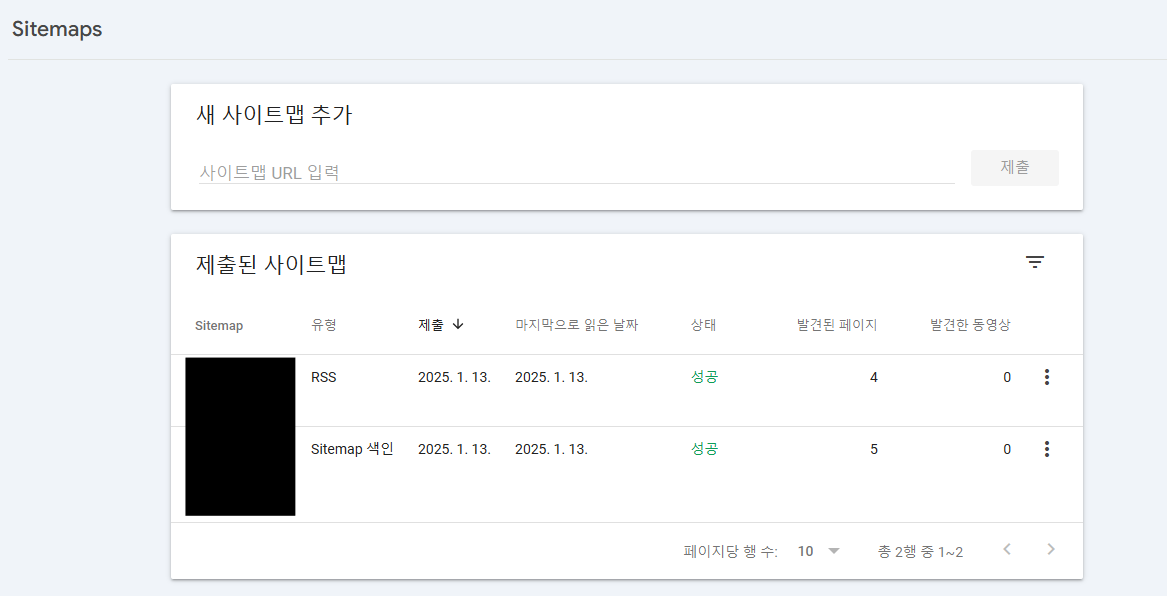 마찬가지로 사이트맵 주소와 RSS주소 제공을 통해 도메인 색인을 요청했습니다.